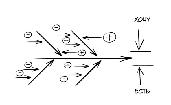 Для поиска причин проблемы существуют разные способы. Вероятно, самый известный и упоминаемый во всех учебниках MBA инструмент – это «рыбья кость», или диаграмма Исикавы. Я не стану рассказывать биографию Каоро Исикавы, а вот об этом инструменте пару слов скажу. Проблема изображается на листе бумаги справа как рыбья голова, в которую упирается позвоночник. Факторы, приводящие к проблеме или усугубляющие проблему, отражают стрелками-позвонками слева направо, к голове-проблеме. В целом все это до безобразия напоминает рыбий скелет. Если при этом есть факторы, нейтрализующие проблему, стрелочки для них тоже рисуются к позвонкам, но «против шерсти», справа налево, от проблемы.