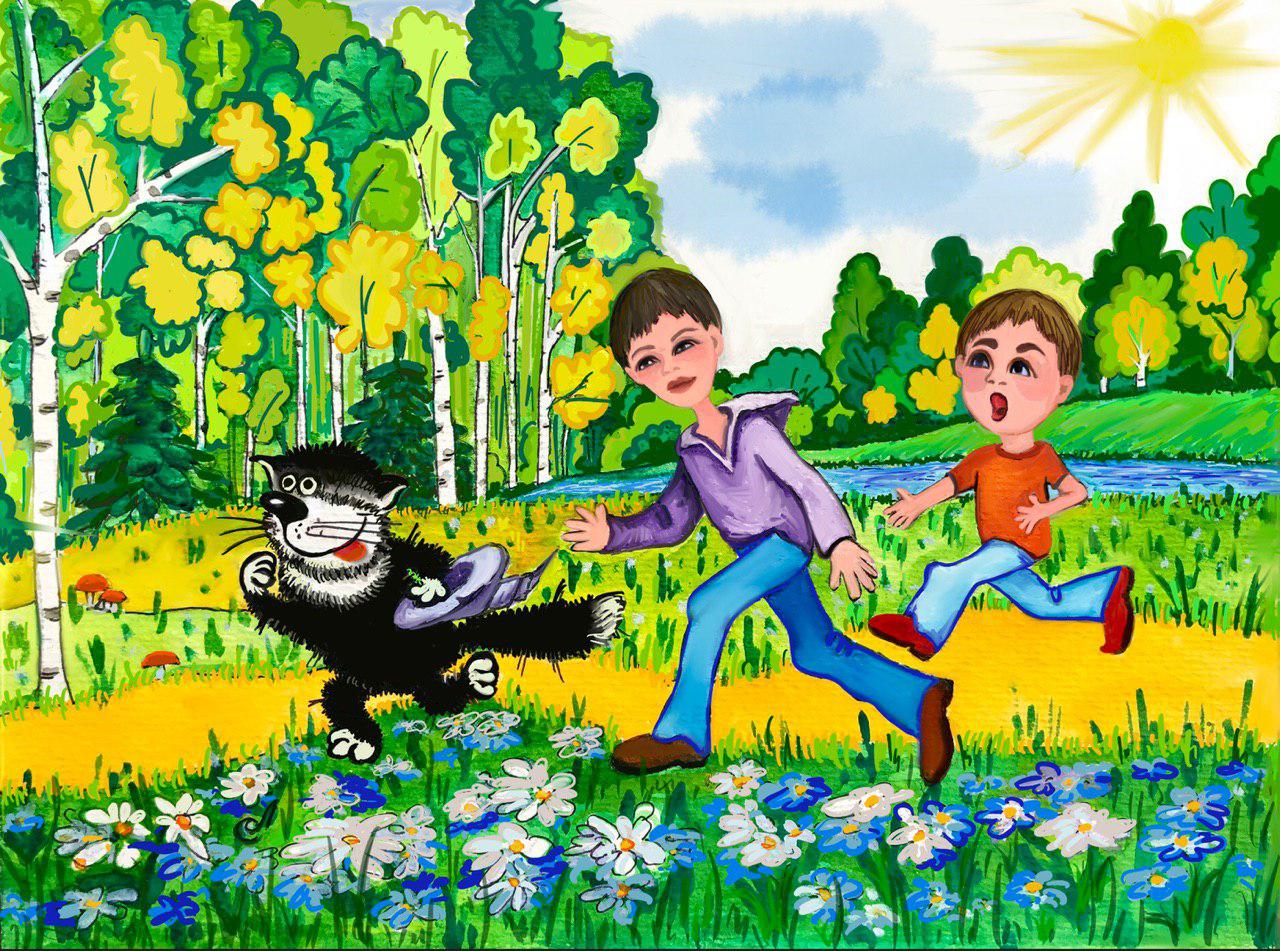 Придя в себя, мальчики погнались за котом. Тайный план котофея сработал. Мальчики побежали и это было их физическое упражнение на это утро.