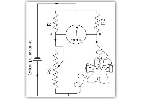 Как вы видите, в схеме есть четыре сопротивления: два эталонных одинаковых сопротивления (R1 = R2), одно сопротивление, которое на старых приборах подстраивали (R3) и в качестве четвертого сопротивления выступает человек, держащий в руках два электрода – металлические цилиндры, так называемые «банки». Соответственно, схема устроена так, чтобы измерять сопротивление тела человека с банками в руках. При этом протекающий через тело человека ток очень мал и сам э-метр никак не воздействует на человека.