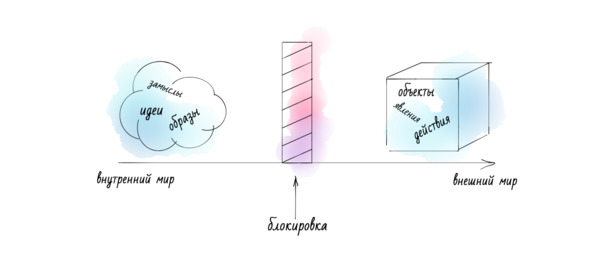 Представим человека, который не может свой замысел превратить в реальность. Почему это происходит? Потому что где-то на пути от внутреннего мира до внешнего, у него возникает блокировка. Он хочет счастливые отношения, а как подумает, что надо знакомиться с девушками – так сразу возникает страх, неуверенность, зажатость и мысли «да кому я нужен такой?» Это и есть блок – что-то не дает свободно двигаться к реализации замысла.