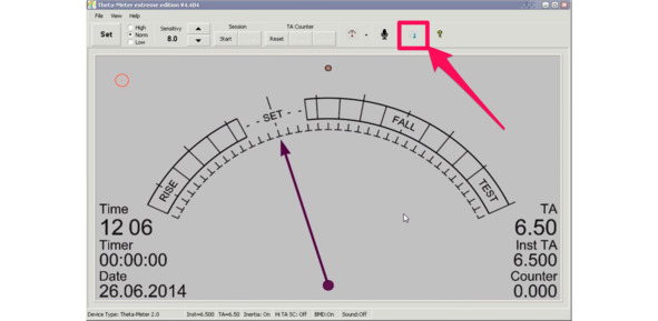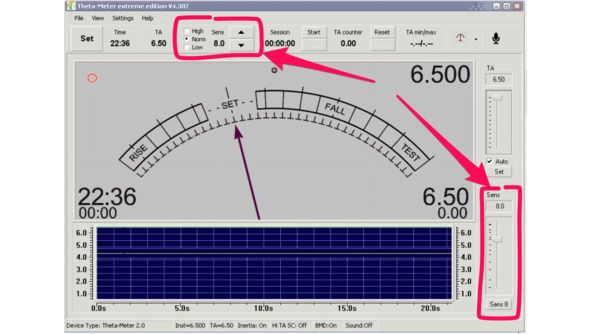 На стрелочном приборе чувствительность устанавливается с помощью регулятора меньшего размера. А на компьютерном Тета-метре – это три отметки-флажка в левом верхнем углу: низкая (Low), нормальная (Norm), высокая (High) чувствительность. Или еще в правом нижнем углу есть ползунок, с помощью которого чувствительность устанавливается более точно.