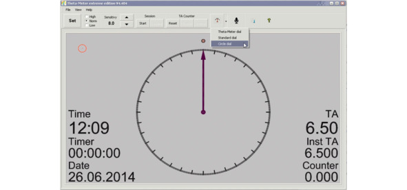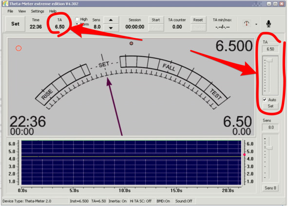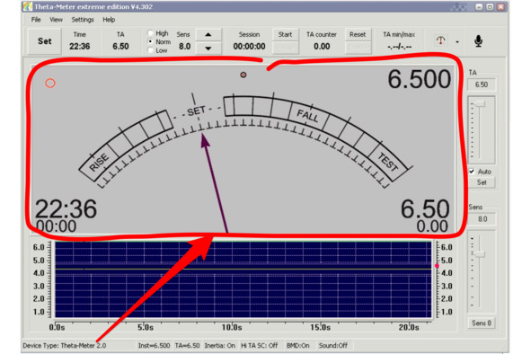 На стрелочных приборах «Ручка тона» – это обычно большой круглый регулятор со шкалой от 0,5 до 6,5. Для компьютерного Тета-метра «Ручка тона» (РТ) – это крупные цифры рядом с сокращением TA (Tone Arm) в левой верхней части экрана. А также ручной регулятор «Ручки тона» справа.