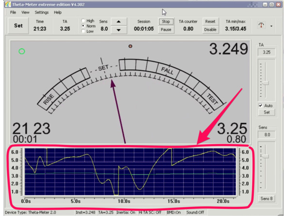 В нижней части экрана Тета-метра происходит автоматическое построение графика движений РТ, на котором видно последние 20 секунд сессии. График может применяться для того, чтобы отследить не было ли за последнее время пропущено показание на которое стоило бы обратить внимание.