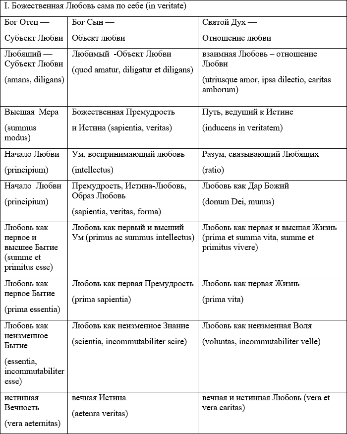 Таблица № 1. Категория любви в тринитарных и антропологических аналогиях блаженного Августина[311]