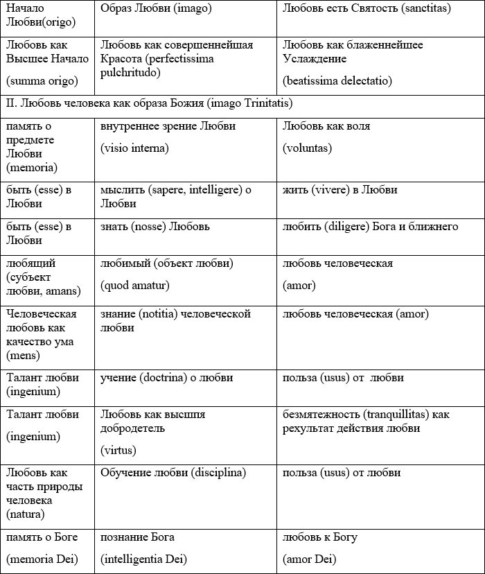 Систематизируем категории, использованные блаж. Августином для обозначения Божественной любви в Троице и человеке в виде таблицы.