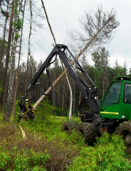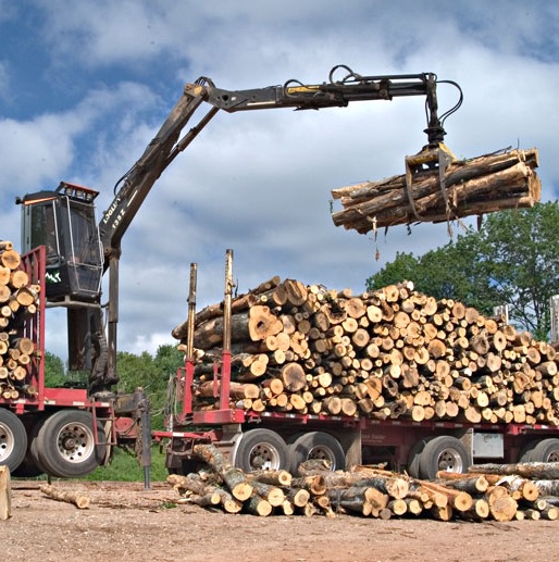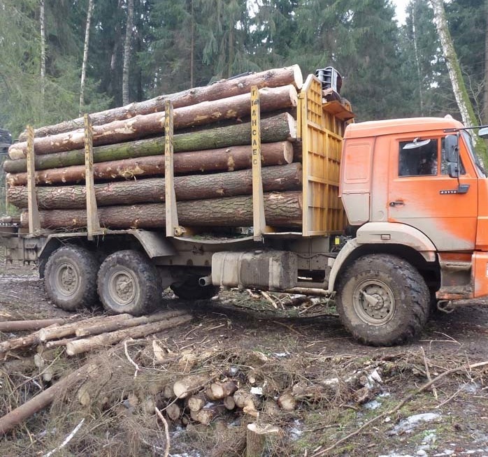После того как деревья спилили и обрезали ветки, другая машина везёт их на бумагоделательный завод.