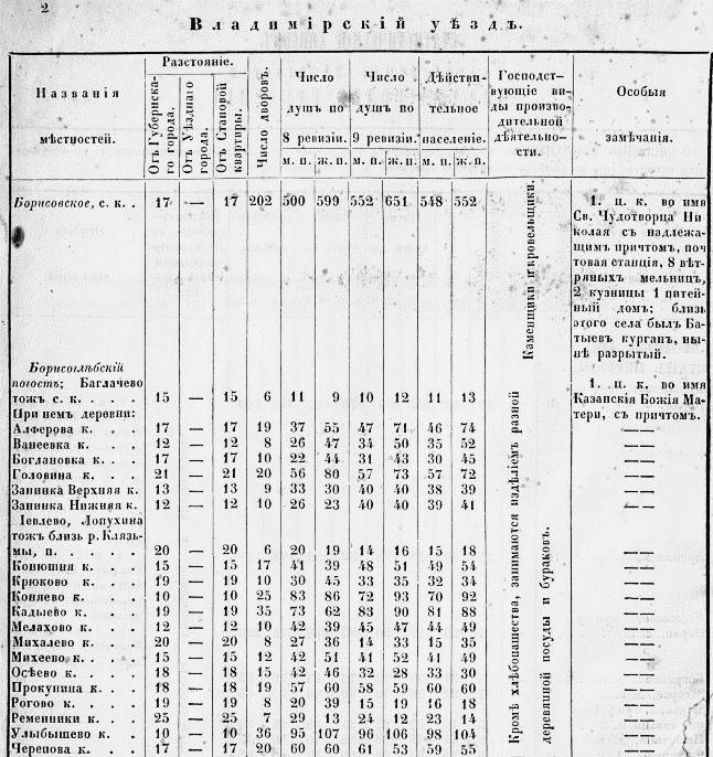 Страница из Статистического списка населенных мест Владимирской губернии 1857 года