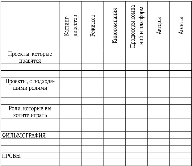 Из титров вам нужно выписать кастинг-директоров, режиссеров, продюсеров (минимум двух) всех проектов по всем категориям в таблице. Так вы определите конкретных людей, которые принимают решение о приглашении актера на пробы и утверждении на роль.