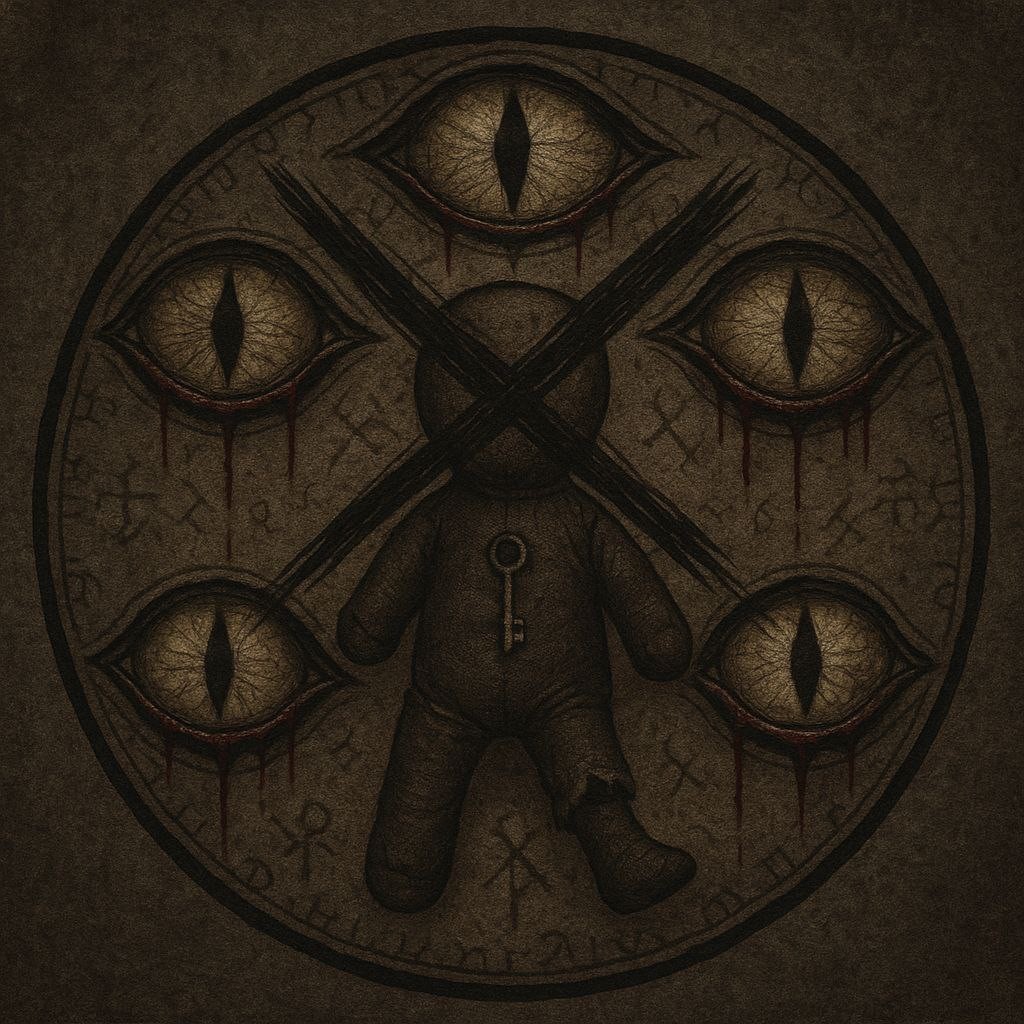 На следующей странице был нарисован символ: шесть глаз, пересечённых крестом, а в центре – кукла без лица.