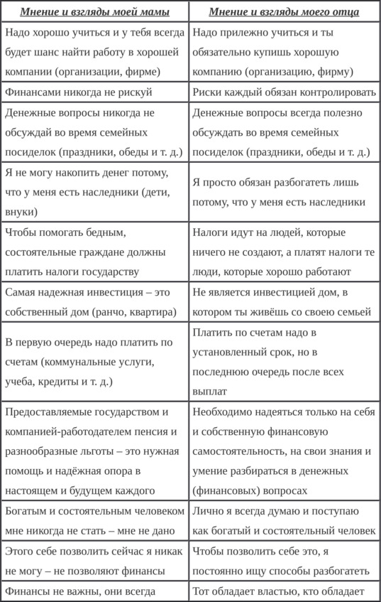У меня были оба родителя (мама и папа) и они своими советами всегда помогали мне выбрать свой путь к финансовому процветанию. Мама была очень образованной и являлась кандидатом наук, доцентом, имела огромный жизненный опыт и всегда была рада дать мне совет – как любая любящая мать. Она хорошо училась в Оксфорде и была очень грамотной женщиной. Отец с трудом окончил школу и получил среднее образование. Мама и папа успешно сделали свою карьеру и всю жизнь напряженно работали. Оба хорошо зарабатывали, но мать постоянно испытывала финансовые трудности, а отец стал одним из богатейших людей современной Америки. И моя мама, и мой отец были стойкими и уважаемыми людьми, у них было много друзей и мы дружили семьями. Оба давали мне ценные жизненные советы, но эти советы были разными. Оба ценили образование, но смотрели на жизнь по-разному. Так как я любил и уважал обоих родителей, то я внимательно выслушивал их обоих, но всегда я имел выбор: выбрать точку зрения мамы или отца. Я всегда внимательно подходил к их советам, долго раздумывал и всегда сам принимал последнее окончательное решение. В то время отец еще не был богатым, а мать не испытывала еще финансовые трудности. У нас была единая, дружная семья и надо было все равно решать финансовое обеспечение нашего семейства. К финансовым вопросам и мать и отец относились по-разному. Мама говорила: «Деньги всегда приносят проблемы и несчастья, но они необходимы и без них не возможно существование человека», отец всегда гордо заявлял: «Деньги можно заработать, надо только очень постараться и сильно захотеть этого».