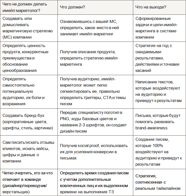 Некоторые знакомые директора по маркетингу жаловались мне, что имейл-маркетолог “не справляется” с обязанностями. Когда мы начинали разбирать дневные “таски”, оказывалось, что на специалиста ложилось много задач, которые лежали за рамками их компетенций (про базовые компетенции мы поговорим в другой главе).
