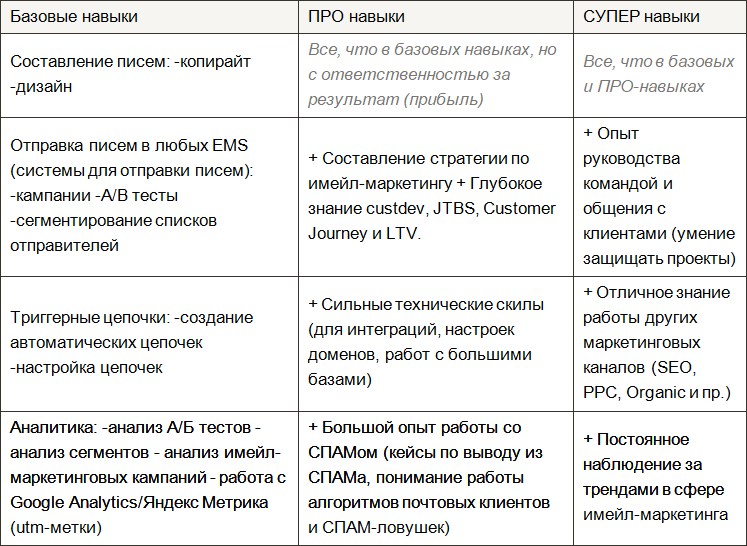Базовые навыки, с которыми можно приглашать на зарплату от 500$ до 1000$, с опытом 1–3 года непосредственно в отправке писем, составлении дизайна, сегментировании аудитории, создания триггерных цепочек, знание Google Analytics и Яндекс. Метрики.