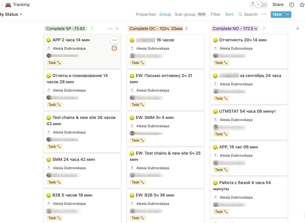 3. Записывает план в Notion (задачи+часы)Практически как в Trello. Мы делаем колонки по месяцам. Сотрудник записывает дедлайны, если есть необходимость со стороны клиента (обычно у нас дедлайны не работают, потому как мотивация итак достаточно сильная)