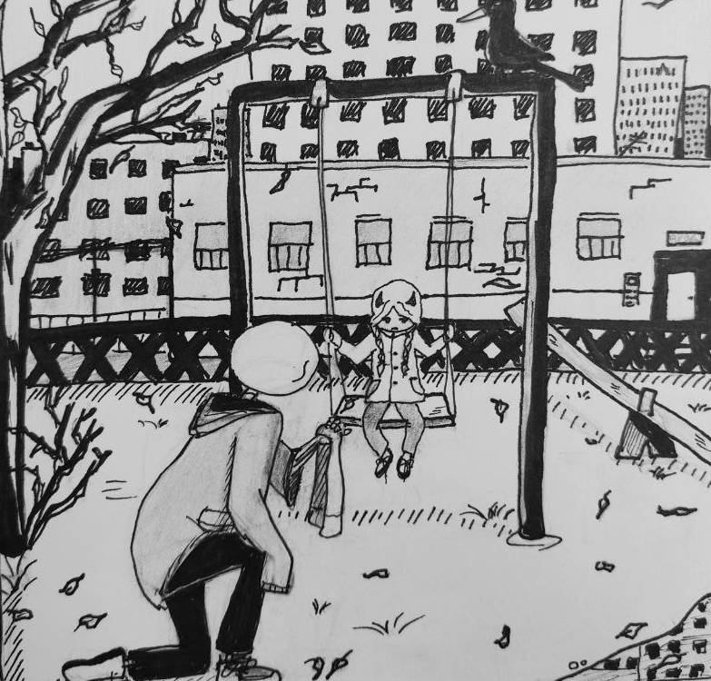 Я наблюдал за окружающим, абсолютно пустым и безжизненным миром, постепенно окончательно успокаиваясь. Даже скамейка показалась мне удобной и немного милой, хотя я не смог бы словами объяснить, в чем конкретно ее милота заключалась. Протяжный металлический скрип вырвал меня из раздумий. Тяжелый, ржавый звук разносился в тишине соседних дворов, монотонный и невероятно раздражающий. Я отодрал доску от скамейки, не особо беспокоясь, что бы на это мне сказали окружающие, и медленно выдвинулся в сторону скрипа. По мере продвижения стало заметно, что чем ближе к тому двору, тем меньше на улице мусора. Детская площадка, к которой я постепенно подходил, была окружена маленьким забором, через который способен переступить взрослый человек. Те же разбитые мусорные баки, те же плохо окрашенные конструкции. На качелях сидела маленькая девочка лет семи-восьми и медленно раскачивалась. Уже издалека я заметил пару рожек на ее макушке.
