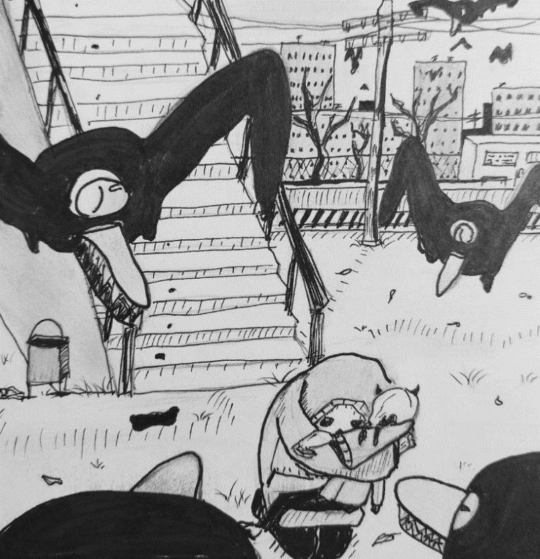 Мы постепенно приближались к той точке, с которой я мог разглядеть существо на проводах во всей своей красе. У него не было перьев, вместо них тело птицы было окутано черной слизью, по густоте напоминавшей мазут. Отсутствовали даже намеки на глаза. Но, будто почувствовав мой взгляд, существо резко крикнуло скрипучим глухим голосом, продемонстрировав горизонтальный клюв, усеянный мелкими острыми клыками. Я тут же пожалел, что не взял с собой хоть что-нибудь, чем можно было бы отбиться от подобного существа, однако оно улетело, как только мы дошли до самого верха. Не переставая кричать, летун скрылся за домами, в той стороне, откуда мы пришли. Я аккуратно опустил девочку на ноги.