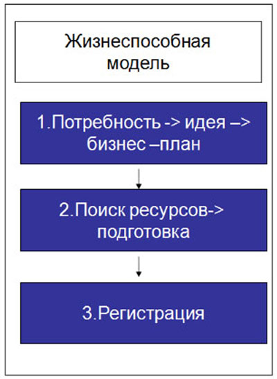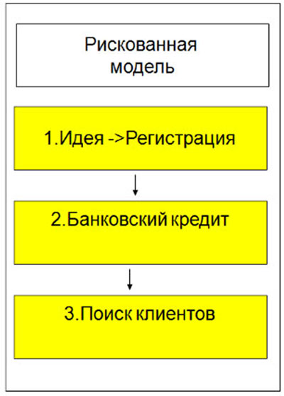 Первая – рискованная модель, которая распространена среди отечественных предпринимателей при запуске своего бизнеса. В этой модели предприниматель интуитивно выбирает бизнес-идею, ему кажется, что она должна работать. Он регистрируется в налоговых органах. Затем с трудом получает кредит в банке, используя чаще всего купленный бизнес-план, который не имеет ничего общего с его планами. И только получив денежные средства и закупив товары, будущий бизнесмен начинает искать своих потребителей.