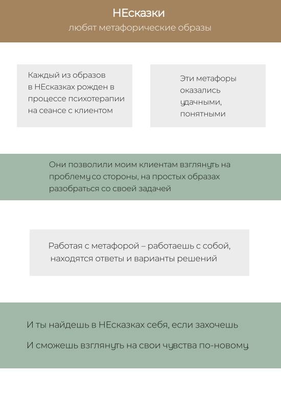 НЕсказки любят метафорические образы. Каждый из образов в НЕсказках рожден в процессе психотерапии на сеансе с клиентом. Эти метафоры оказались удачными, понятными. Они позволили моим клиентам взглянуть на проблему со стороны, на простых образах разобраться со своей задачей. Работая с метафорой – работаешь с собой, находятся ответы и варианты решений. И ты найдешь в НЕсказках себя, если захочешь. И сможешь взглянуть на свои чувства по-новому.