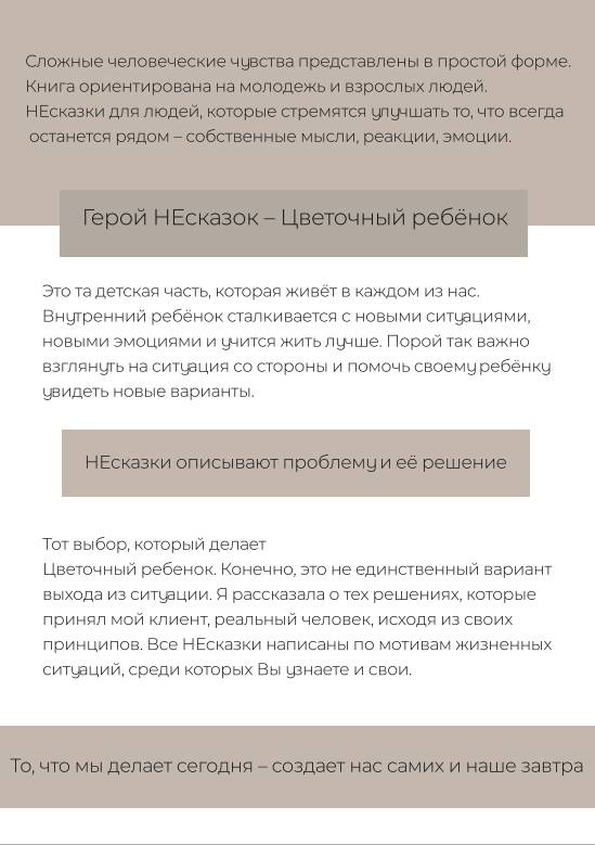 НЕсказки описывают проблему и её решение. Тот выбор, который делает Цветочный ребёнок. Конечно, это не единственный вариант выхода из ситуации. Я рассказала о тех решениях, которые принял мой клиент, реальный человек, исходя из своих принципов. Все НЕсказки написаны по мотивам жизненных ситуаций, среди которых Вы узнаете и свои.