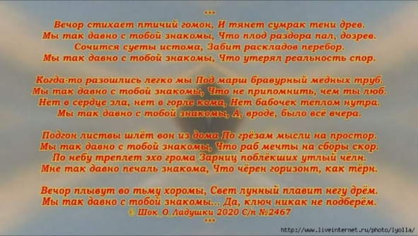 ***Вечор стихал не птичий гомон,То сумрак тискал тени древ.Мы так давно с тобой знакомы,Что плод раздора пал, дозрев.Сочилась суеты истома,Забит раскладов перебор.Мы так давно с тобой знакомы,Что утерял реальность спор.Когда-то разошлись легко мыПод марш бравурный медных труб.Мы так давно с тобой знакомы,Что не припомнить, чем ты люб.Нет в сердце зла, нет в горле кома,Нет бабочек теплом нутра.Мы так давно с тобой знакомы,А, вроде, было всё вчера.Подгон листвы шлёт вон из домаПо грёзам мысли на простор.Мы так давно с тобой знакомы,Что раб мечты на сборы скор.По небу треплет эхо громаЗарниц поблёкших утлый чёлн.Мне так давно печаль знакома,Что чёрен горизонт, как тёрн.Вечор стиха лад плыл в хоромы,Свет лунный плавил негу дрём.Мы так давно с тобой знакомы…Да, ключ никак не подберём.© Шок_о_ладушки, 2020 С/п №2467