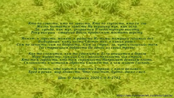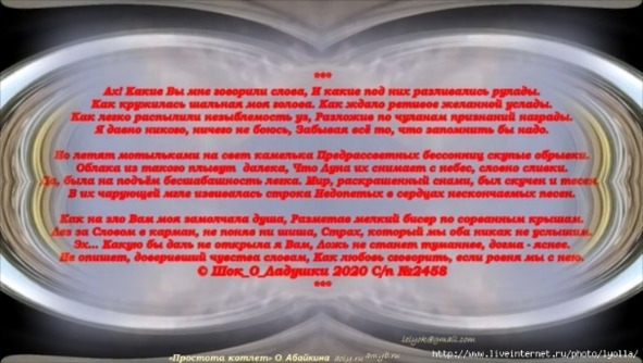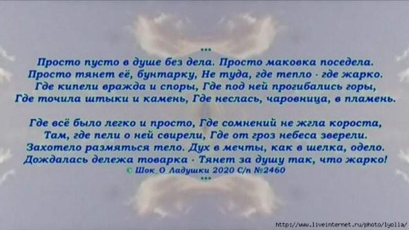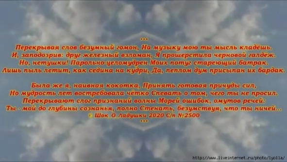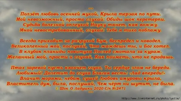 ***Ползёт любовь осенней мухой,Крыла терзая по пути.Мой невозможный, просто слухай:Обиды шок перетерпи.Судьба болезной оплеухойНауку тянет, как вожжу.Мной невостребованный, слухай:Тебе я тихо поблажу.Всегда приходит за разрухойБум, беспредел и новодел.Великолепный мой, послухай,Что жаждешь ты, и Бог хотел.В клубок планиды повитухаПослед смотала за кураж.Желанный мой, прости и слухай,Как поиметь, что не продашь.Птах заревой пусть квохчет глухо,Ты сердце злом не береди.Любимый! Долетит до слухаБлагая весть: «Лад впереди!»Влачит морями, небом, сушейЛюбовь амуровы крыла,Властитель дум, была, послушай,Чем чёрт ни шутит, не была.© Шок_о_ладушки, 2020 С/п №2471