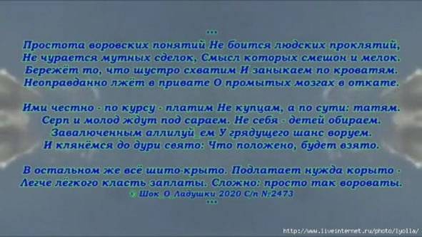 ***Простота воровских понятийНе боится людских проклятий,Не чурается мутных сделок,Смысл которых смешон и мелок.Бережёт то, что шустро схватимИ заныкаем по кроватям.Неоправданно лжёт в приватеО промытых мозгах в откате.Ими честно – по курсу – платимНе купцам, а по сути: татям.Серп и молод ждут под сараем.Не себя – детей обираем.Завалюченным аллилуй_емУ грядущего шанс воруем.И клянёмся до дури свято:Что положено, будет взято.В остальном же всё шито-крыто.Подлатает нужда корыто —Легче лёгкого класть заплаты.Сложно: просто так вороваты.© Шок_О_Ладушки, 2020 С/п №2473