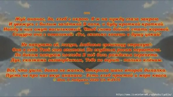 ***Жуй ананас, да, хлеб с икрою.Я ж на нужду глаза закроюИ увяжусь с былым залёткойВ поля, и буду кроткой-кроткой.Найду в них омут васильковый,Чтоб снова дойной стать коровой.Сощурю очи с поволокой:«Ты, сколько хочешь в душу цокай!Не напугать её, лихую,Любовью грешницу страхую!»Она в себя Твой гнев впиталаПо скудным росам первотала.По диким потугам последаВ ней боль рожденья перепета.Дух, сказками заговорённым,Тебе не верит – только клёнам.Всё, что ушло, давно не жалко,Открыла шанс второй дыхалка.Пусть не про нас вкус ананаса —Есть хлеб простой и море кваса.© Шок_о_ладушки, 2020 С/п №2475