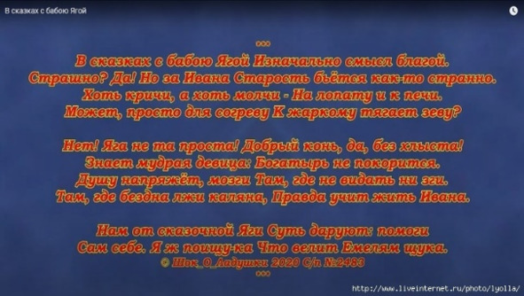 ***В сказках с бабою ЯгойИзначально смысл благой.Страшно? Да! Но за ИванаСтарость бьётся как-то странно.Хоть кричи, а хоть молчи —На лопату и к печи.Может, просто для согревуК жаркому тягает зеву?Нет! Яга не так проста!Добрый конь, да, без хлыста!Знает мудрая девица:Богатырь не покорится.Душу напряжёт, мозгиТам, где не видать ни зги.Там, где бездна лжи каляна,Правда учит жить Ивана.Нам от сказочной ЯгиСуть даруют: помогиСам себе. Я ж поищу-ка,Что велит Емелям щука.© Шок_о_ладушки, 2020 С/п 2483
