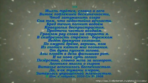 ***Мысль трётся, словно о zeroВиток поблёкшей бесконечности,Чтоб затуманить озероСна тем, что недостойно вечности.Бред течью полнит водоёмКраеуголья беспристрастия.Предтечи честью воздаём.Граалем рву слова на страсти я.В скабрезность стрёмно – бережкомВедёт дремучее сознание.По хмурой дрёме, веришь, комИз глотки катит миг познания.От думы пухнет голова.Азы плюёт в дела фальшиво рот.И не нова суть гологоПозёрства, словно мгла за шиворот.Легонько мысли о сыромВитанье вспенилось беспечностью.Да, как туманы озером,Затёрлось упрощённой млечностью.© Шок_о_ладушки, 2020 С/п 2908