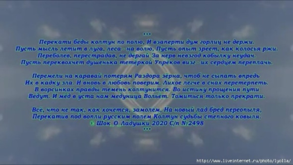 ***Перекати беды колтун по полю,И взаперти дум горлиц не держи.Пусть мысль летит в луга, леса – на волю,Пусть опыт зреет, как колосья ржи.Переболев, перестрадав, не дёргайЗа нерв невзгод кобылку неудач.Пусть переквохчет душенька тетёркойУпрёков визг – их сердцем переплачь.Перемели на каравай потерямРаздора зёрна, чтоб не сыпать впредьИх в кадку зла. И вновь в любовь поверим.Лихое легче в снах перетерпеть.В ворсинках правды темень колтунится.Во истину прощения путиВедут. И мёд в уста нам медуницаВольёт. Томиться только прекрати.Всё, что не так, как хочется, замолем,На новый лад бред переопыля,Перекатив под вопли русским полемКолтун судьбы степного ковыля.© Шок_о_ладушки, 2020 С/п 2498