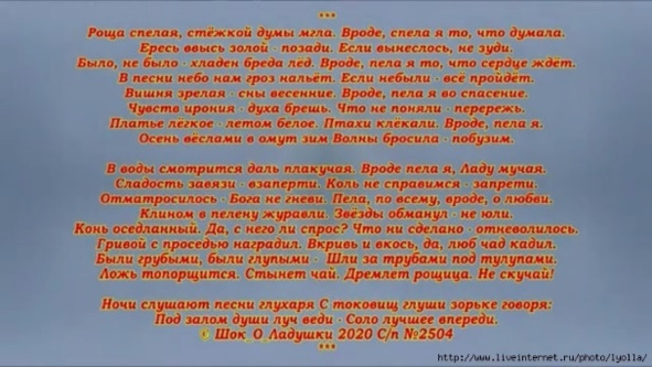 ***Роща спелая, стёжкой думы мгла.Вроде, спела я то, что думала.Ересь ввысь золой – позади.Если вынеслось, не зуди.Было, не было – хладен бреда лёд.Вроде, пела я то, что сердце ждёт.В песни небо нам гроз нальёт.Если небыли – всё пройдёт.Вишня зрелая – сны весенние.Вроде, пела я во спасение.Чувств ирония – духа брешь.Что не поняли – перережь.Платье лёгкое – летом белое.Птахи клёкали. Вроде, пела я.Осень вёслами в омут зимВолны бросила – побузим.В воды смотрится даль плакучая.Вроде пела я, Ладу мучая.Сладость завязи – взаперти.Коль не справимся – запрети.Отматросилось – Бога не гневи.Пела, по всему, вроде, о любви.Клином в пелену журавли.Звёзды обманул – не юли.Конь оседланный. Да, с него ли спрос?Что ни сделано – отневолилось.Гривой с проседью наградил.Вкривь и вкось, да, люб чад кадил.Были грубыми, были глупыми —Шли за трубами под тулупами.Ложь топорщится. Стынет чай.Дремлет рощица. Не скучай!Ночи слушают песни глухаряС токовищ глуши зорьке говоря:Под залом души луч веди —Соло лучшее впереди.© Шок_о_ладушки, 2020 С/п 2504
