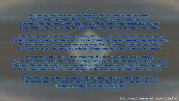 ***Ветшая, тянется «перо к бумаге»,Аки в овраги талая вода.Рабы соблазна перед Богом наги.Я молодым не буду никогда.Чувств буря прополощет дней посуду,Как будто, ей неведомый покойОткроет суть: я никогда не буду,Ответ искать, как отрок молодой.Пока ж зачем-то «звёзды зажигаем»,По слухам, хорошо живут, где прут.Предательство спешит, таясь, за Гаем,Чтоб пал он молодым, стареет Брут.Ты очень многим – многим ты знакома,Рука Судьбы, садящая под дых:Из горла комом в травушку у дома,Истоптанную в схватках молодых.Отечество давно не мает сласти.Я и без них нос к небу задеру,Пусть молодые треплют власти: Слазьте!Бумажный парус бросится к перу.Поняв, что краткий миг у нас украден,Застав меня со старостью врасплох,Из молодильных яблок ль, виноградинВина младого бродит в жилах сок.Открыв пути и греку, и варягу,Втянув отчизны горьковатый дым,На вёсла утлой лодочки налягу,Томя не Будду – больше молод Им.© Шок_о_ладушки, 2020 С/п 2506