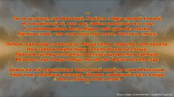 ***Ты не услышал зов девчачий,Увлёкся с дуру старой клячей,И, покорённый ей, как мог,Забыл невинной неги слог.А я тогда рыдала долго,Ища в себе урон без толка,Пустив слова, что злом лихи,На песни, басенки, стихи.Потом, как рыба, замолчала.Конца нет в страсти, нет начала.Но в гиблом омуте душиТопить былое не спеши.Над ним листву позолотилоОсенней щедростью светило.Казалось, дух потуг потух,Но что-то дерзко режет слух.Давай-ка всё переиначим:Толк юный твой по снам девчачьим,Чтоб нам, побитым слегонца,Начать любовный сказ с конца.© Шок_О_Ладушки, 2020 С/п №2463