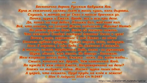 ***Бесконечно дорогаРусским бабушка Яга.Куча ж сказочной халявыЛьёт в мозги чушь, коль дырявы.Слушай, и мотай на усСказ о пользе брачных уз.Печка, щука и Емеля.Вроде, все и вся при деле.Да, попал на пир дебил,Плошки бил, мёд-пиво пил.Всё, что хочешь, на лопатеЖизнь подносит: «Жрите! Нате!»Но ревёт царёва дочь.Батя ей спешит помочь.Что сказать? Сладка житуха!Ляпота! Тепло и сухо!Бочка, море, карантин!С ней Емеля – не один!Стонет нудная супруга:Нужен терем, конь, подпруга.Знал б заранье, в чём беда,Не женился б никогда.А теперь, изволь трудиться,Ведь, жена – не рукавица.Щука, сделай, как велит.Не девица – динамит.Мозг взорвали вопли бабы.Сказка – ложь. Да, кабы-кабы…Смысл, конечно же, другой,Чем навеянный Ягой.Не нужда б, кем стал Емеля,Непроверенный на деле?Блажь на выдумки годна.Жалко: щука лишь одна.А царей, что охамели,Пруд пруди на клёв к земеле!© Шок_о_ладушки, 2020 С/п 2487