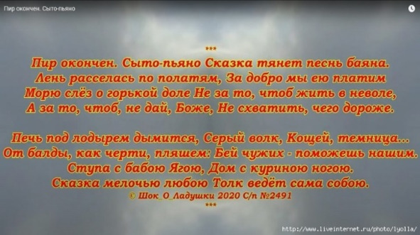 ***Пир окончен. Сыто-пьяноСказка тянет песнь баяна.Лень расселась по полатям,За добро мы ею платимМорю слёз о горькой долеНе за то, чтоб жить в неволе,А за то, чтоб, не дай, Боже,Не схватить, чего дороже.Печь под лодырем дымится,Серый волк, Кощей, темница…От балды, как черти, пляшем:Бей чужих – поможешь нашим.Ступа с бабою Ягою,Дом с куриною ногою.Сказка мелочью любоюТолк ведёт сама собою.© Шок_о_ладушки, 2020 С/п 2491