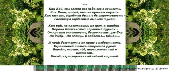 ***На ветер нездешний тоскою окликнуло…На Веру, как горца кинжал, неслучайное…Потянет обманом – травой-повиликою…Ответом – туманное… томное… дальнее….Наветы омоют печаль многоликую…Настроит мираж притяженье печальное…И скроет простое… земное… ВеликоеЗа дивною кривдою правое тайное….На веки рассыплется звездными бликамиТревога от Бога в душе изначальнаяДо боли собою в сознание скрытая —На волю тобою, как песнь величальная!Спасибо за Мир и Энергию!