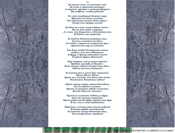 ***Спасибо за Мир и Энергию!Спасибо за сына и дом!За голос, что слышит Вселенная!За Светлую боль о былом!.Спасибо, что мной не измерено,Исполнит твои пусть мечты!И Космосу жизнь наша вверена —С судьбою давно мы на «ты»!Тоску, как высохший валежник