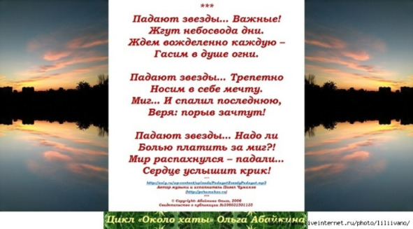 Падают звезды… Важные!Жгут небосвода дни.Ждем вожделенно каждую —Гасим в душе огни..Падают звезды… ТрепетноНосим в себе мечту.Миг… И спалим последнюю,Веря: порыв зачтут!.Падают звезды… Надо лиБолью платить за миг?!Мир распахнулся – падали…Сердце услышит крик!