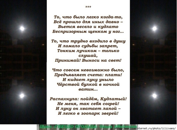 ***То, что было легко когда-то,Всё прошло для иных давно —Вьется весело и кудлатоБеспризорным щенком у ног…То, что трудно входило в душуИ ломало судьбы запрет,Тонким лучиком – только слушай,Принимай! Выноси на свет!Что совсем невозможно было,Предъявляет счета: плати!И кидает луну унылоЧёрствой булкой в ночной ватин…Распахнула: пойдём, Кудлатый!Не меня, так себя согрей!И луну он хватает лапой —И легко в зоопарк зверей!