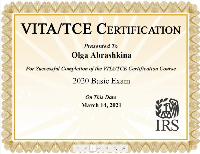 Читайте мою книгу «Я видела Голос!» о том, как я работала на самую известную в России американскую радиостанцию. Как волонтёр около 10 лет работала в центрах по налогообложению Эй Эй Ар Пи (Американская ассоциация пенсионеров (American Association for Retired Persons, AARP)) и Налогового управления США (Internal Revenue Service (IRS)) для малообеспеченных граждан. Ниже, мой ежегодный сертификат, подтверждающий прохождение обязательного курса: