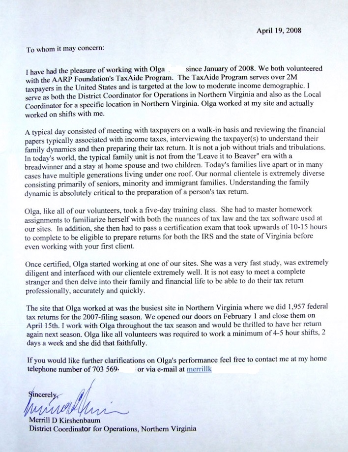 Я имел удовольствие работать с Ольгой с января 2008 года. Мы оба были добровольцами в программе ТаксЭйд (TaxAide) Фонда Эй Эй Ар Пи. Программа ТаксЭйд обслуживает более 2 миллионов налогоплательщиков в Соединенных Штатах и ориентирована на людей с низким и умеренным доходом. Я выступаю как окружной координатор операций в Северной Вирджинии, так и местный координатор в конкретном месте в Северной Вирджинии. Ольга работала на моем участке и фактически работала со мной посменно.