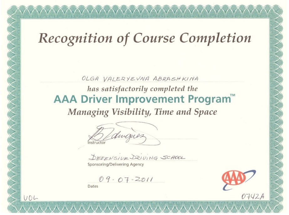 За хорошее вождение вам, как водителю, ежегодно присуждают баллы, а при нарушениях эти баллы списываются. Чтобы повысить количество баллов можно проходить специальные недельные курсы каждый год – программа баллов за безопасное вождение или курсы безопасного вождения (Safe Driving Points Program or defensive driving course). Вы можете получить в дополнении к вашим ещё 5 баллов за прохождение курса ежегодно. Чем больше у вас баллов, тем меньше вы будете платить за страховку автомобиля. Ниже, мой сертификат после прохождения программы повышения квалификации водителей от AAA (Американской автомобильной ассоциации) в Вирджинии: