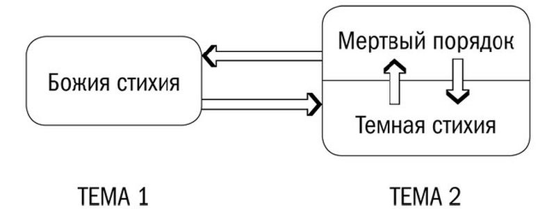 Вместе с С. Б. Рудаковым отказываясь от тематического противопоставления этого Петра и этого Евгения, мы все же не отказываемся от старой идеи «сонатного построения» МВ – только двутемность поэмы представим иначе. Во-первых, не будем, как уже говорилось, сводить темы к персонажам; во-вторых, как тоже уже говорилось, будем иметь в виду три силы, распределенные по этим двум темам: не «закон» и «стихию» (или «деспотизм» и «вольность» или «неподвижное, мертвое» и «подвижное, живое»), но: