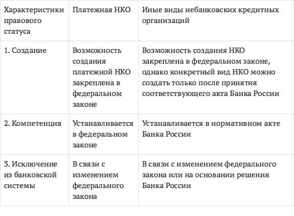 Отличия правового статуса платежных НКО от иных небанковских кредитных организаций