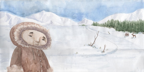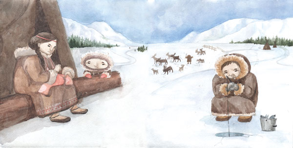 мама шьет одежду, старший брат пасет оленей, отец ушел на рыбалку.