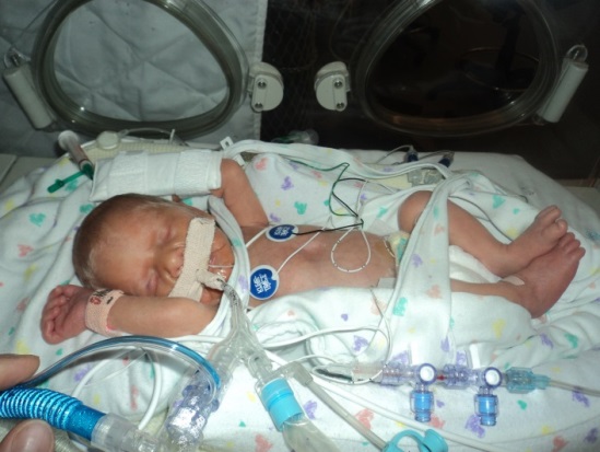 “An oxygen tube, taped to baby’s mouth, is going down into his lungs to help him breathe. The sensors on his chest check his oxygen, pulse, heartbeat and body temperature. The umbilical intravenous line is inserted though his belly button, so we can draw blood for labs. The PICC line (a prolonged IV) is inserted in his hand, so we can send in nutrition and medications.”