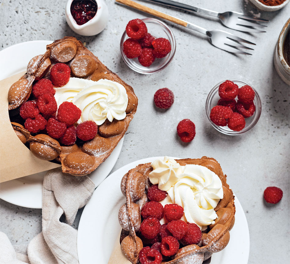 Вафли, которые уверенно завоевывают популярность по всему миру. Их называют пузырчатыми (bubble waffle) или яичными (egg waffle) за необычную форму. Тесто имеет жидкую консистенцию, что позволяет равномерно распределить его между ячеек вафельницы. Но главная особенность гонконгских вафель – многообразие вкусов. В каждую ячейку вафельницы можно положить начинку: ягоды, фрукты, конфеты, шоколад, марципан, овощи, сыр и даже мясо. Каждая ячейка не связана с соседней, а это значит, что одна только вафля может содержать в себе сразу несколько начинок. Подача бывает как сладкой – с мороженым, взбитыми сливками и конфетами, так и несладкой, сытной: в виде сэндвича с овощами, сыром, беконом или колбасой. Для приготовления нужна специальная вафельница с ячейками, найти которую не составит труда.