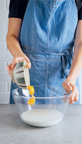 • В другую миску влейте жидкие ингредиенты (молоко, масло, желтки) и добавьте сахар