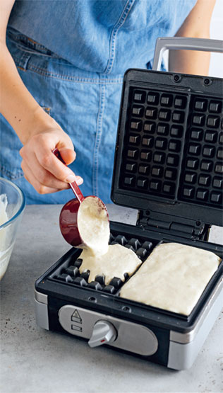 • Вылейте тесто большой мерной ложкой в разогретую вафельницу