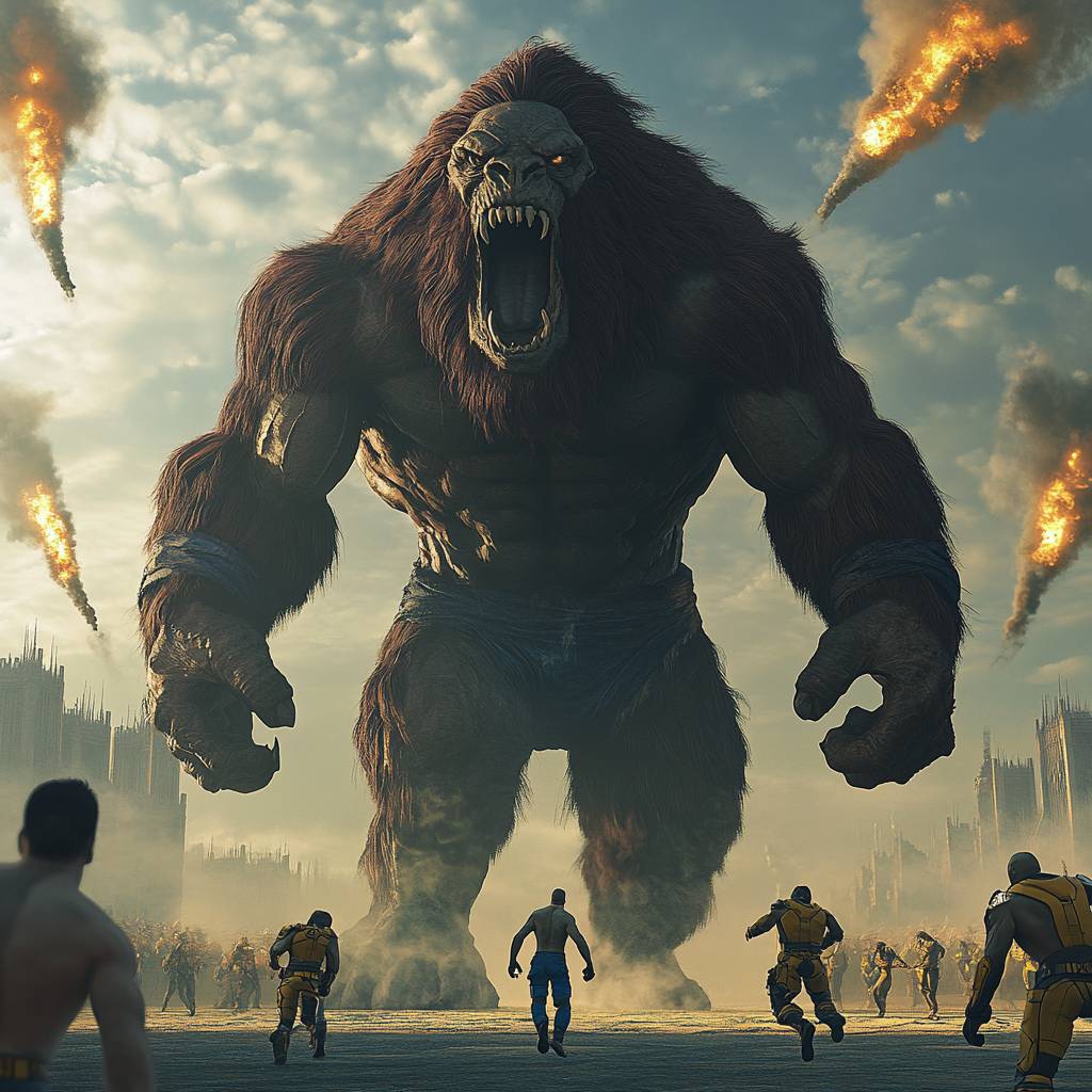 На поле громыхал огромный сорокаметровый великан. Его звериная пасть сверкала острыми зубами, части тела покрывала густая шерсть, а его массивные ноги топали по земле в каких-то нелепых шерстяных трусах, но от этого он не казался менее грозным. Великан шел прямо через поле, как неостановимая лавина, сметая защитников, которые разлетались в стороны, как кегли.