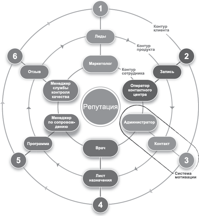 Итак, как может выглядеть маршрут клиента в клинике: маркетолог → оператор контактного центра → welcome-менеджер → администратор → врач → менеджер по сопровождению → медсестра. После того как лечебный случай завершен, в дело вступает менеджер по лояльности, который оценивает удовлетворенность пациента и предлагает ему другие услуги (скажем, приглашает на диспансерный прием). Безусловно, это не точный маршрут. Тем не менее для понимания того, как функционирует контур, этого достаточно.